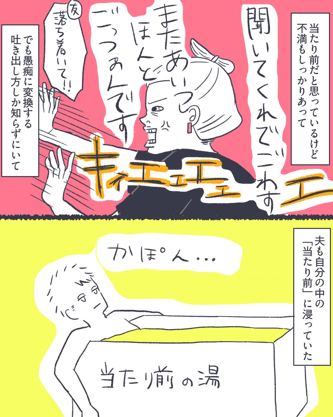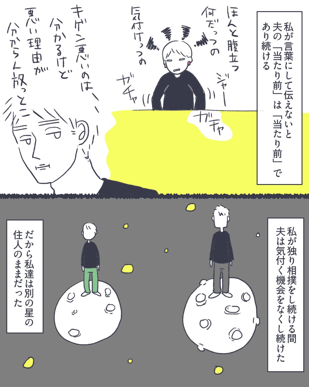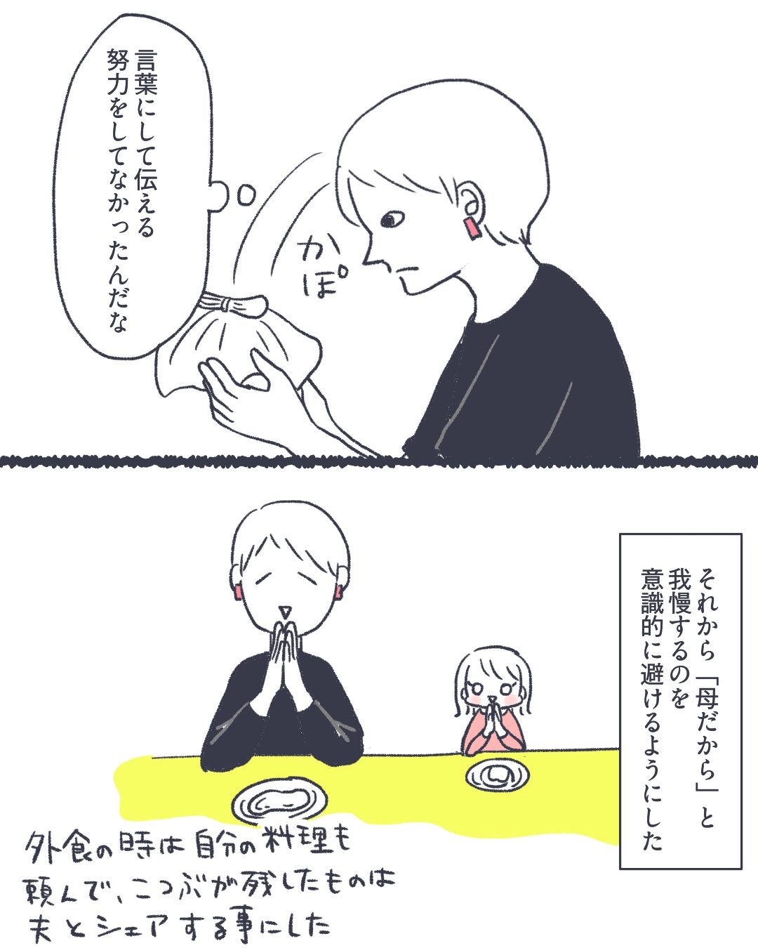 ごはん問題、私だけかなあ食い意地張ってんのかなあとちょっとビクビクしながら描いていたんですが、DMで共感の声を頂けて安心したと共に、これがセオリーだと思っている人って凄く多いんだろうなと思いました。
