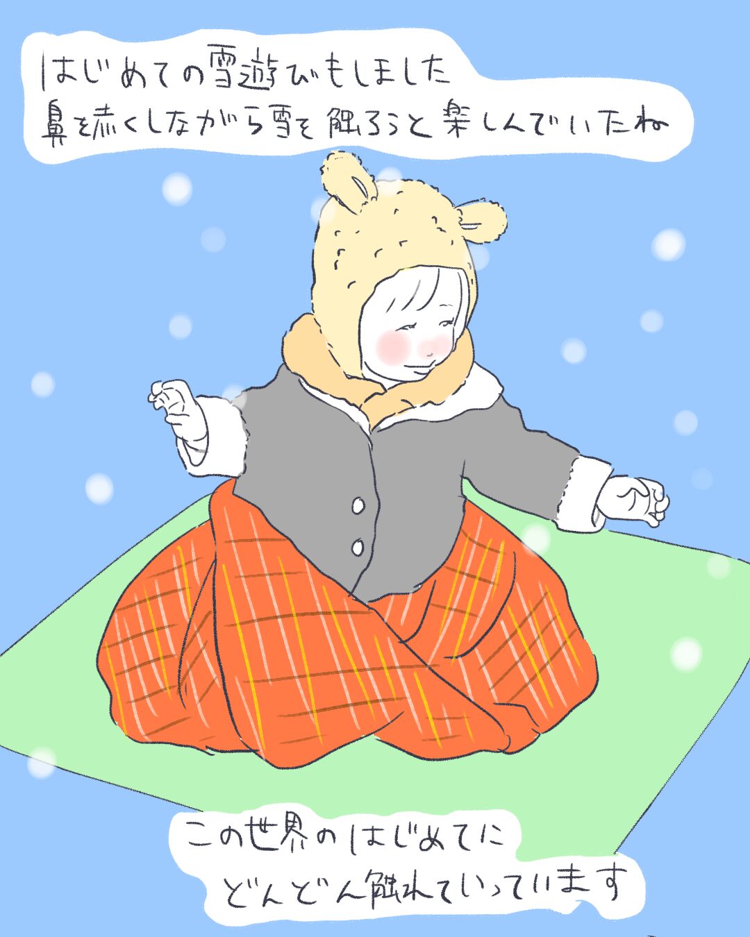 この頃のこつぶ、まだ歩けず何かに掴まらないと歩くことも出来なかったんですがどうにか雪遊びを経験してほしくて、家の前にレジャーシートを敷いてあれ着せこれ着せ毛布を掛けといったもこもこスタイルで臨みました。通行人の人が「何してんだあれ」って顔してたのを思い出します。