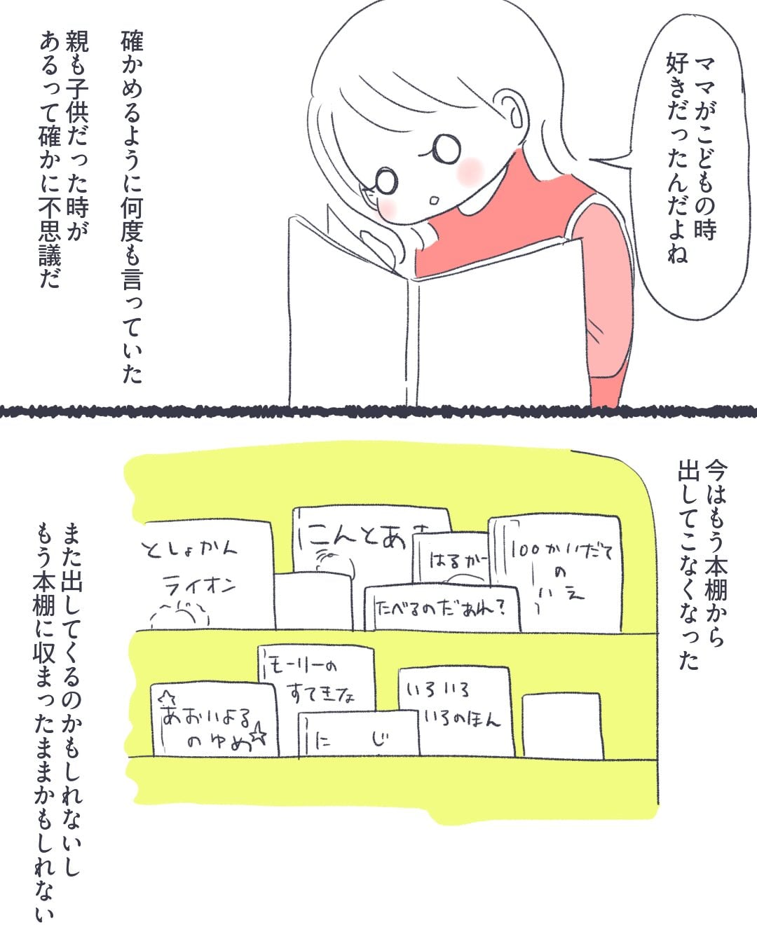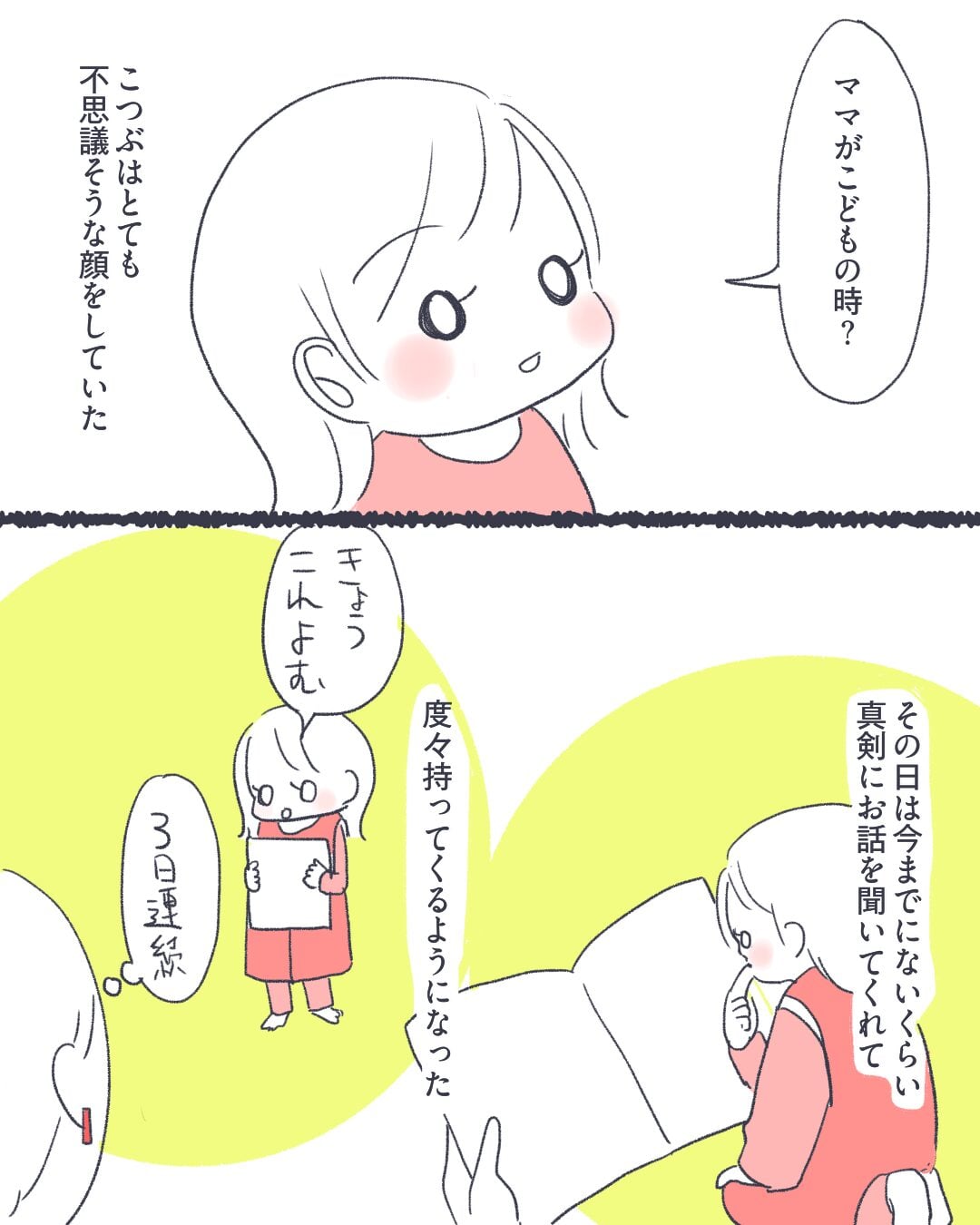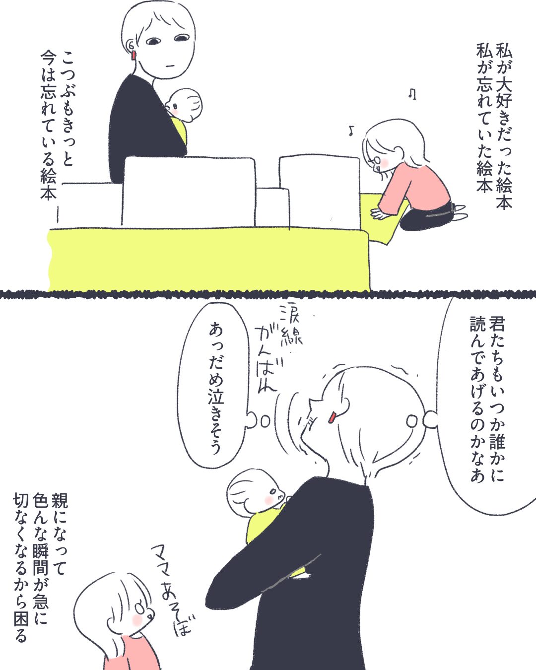 こつぶが私の子供の頃や私の「好き」をなぞろうとしてくれる姿を見るとくすぐったいやら嬉しいやらで、私も親の子供の頃の話を聞くの好きだったなあとか、娘たちが大人になった時にこの絵本思い出してくれるかなあとか、色々な事に思いを馳せては一人涙腺緩ませたりしてます。